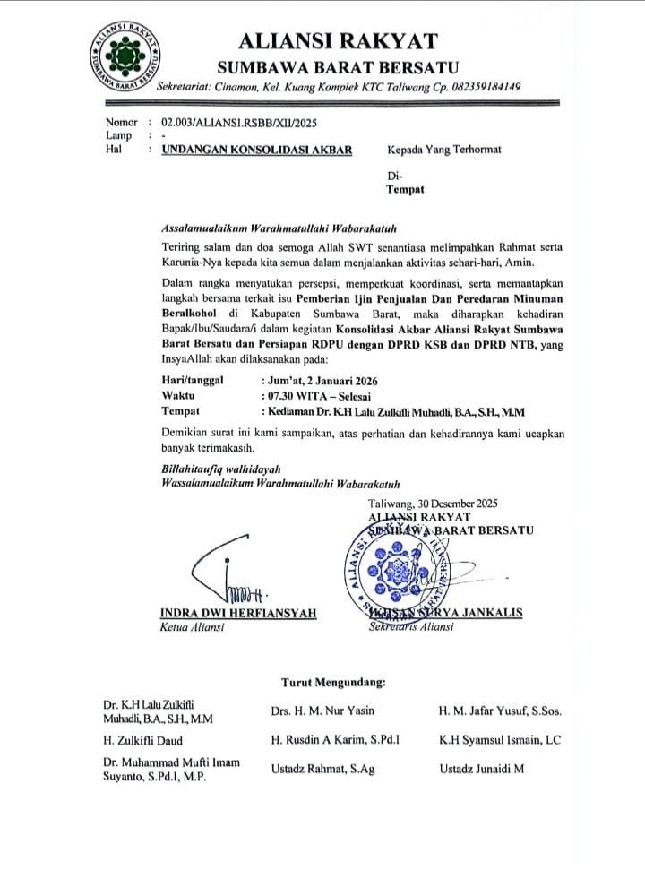 Aliansi Rakyat Sumbawa Barat Bersatu memastikan akan menggelar Konsolidasi Akbar sebagai bentuk perlawanan kolektif atas kebijakan yang dinilai mencederai nilai sosial, budaya, dan religius masyarakat KSB.
